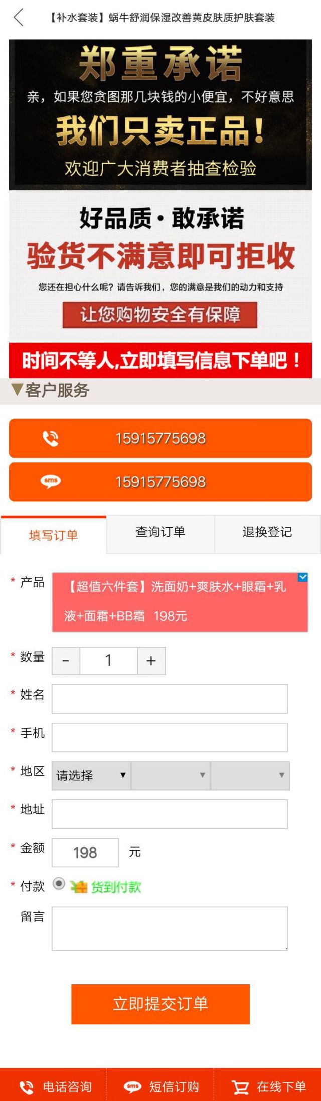 点击“立即购买”跳转落地页。落地页是广告主自制的DIY落地页,里面的内容一般第一屏是整体的产品展示和立即购买按钮,再往下是产品详情,类似于我们在购物的时候“淘宝的宝贝详情”,再往下就是广告主给用户的承诺,例如“正品、可拒收”等承诺,获取用户信任,促进用户下单。