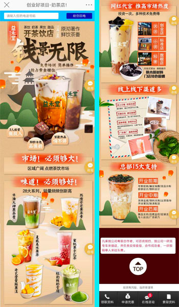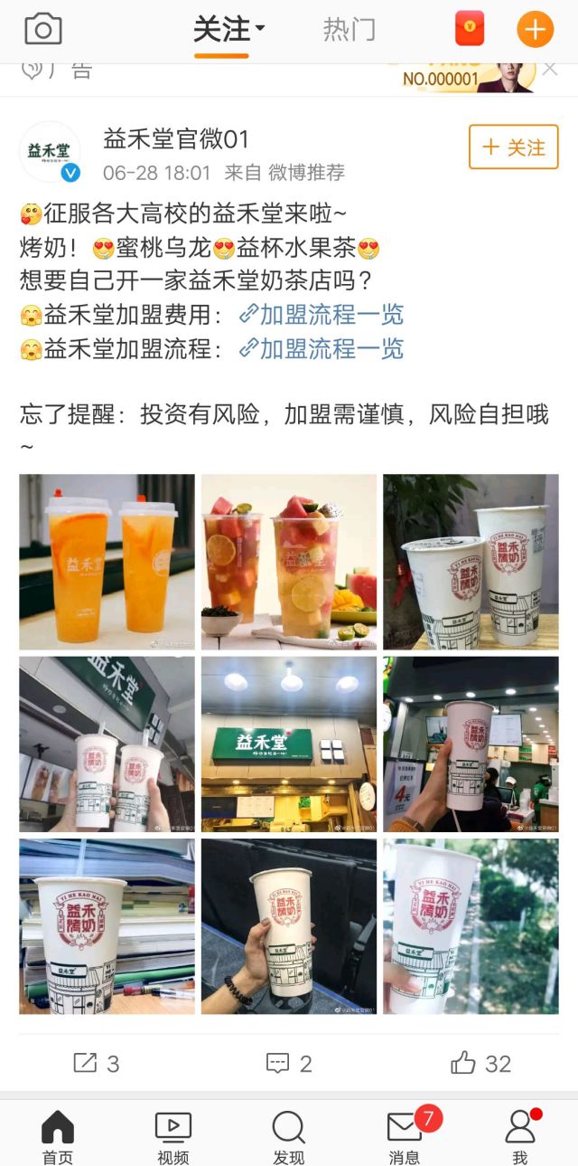 开奶茶店可以说是一年四季没有淡季的时候,在快手抖音爆红的有很多奶茶,可见用户对奶余额宝危机公关茶这口还是非常喜欢的,用户喜欢自然需求就多,当下奶茶可以说不用担心销量,即使是夏天天气热也还有用户会选择点外卖的形式当做下午茶。 当下,各奶茶品牌都在招商加盟寻找加盟的小伙伴,这种形式也是企业发展的一种,所以我们看到最多的应该是一点点奶茶和coco的广告,其他奶茶品牌也有很多,例如黑泷堂、老虎堂等奶茶品牌也都在招商加盟,之前我们也分享了很多奶茶方面的招商加盟的广告案例,小伙伴们想要看更多的招商加盟品牌的广告案例可以去进“广告案例-招商加盟”那页看到更多,还有餐饮行业以及其他行业的招商加盟广告案例,不过最多的还是奶茶方面的招商加盟广告。 今天小编再来分享一个奶茶行业的招商加盟广告,此广告的广告主是“益禾堂”,投放的广告平台是“微博广告”。 外层展示: 广告文案开始以“征服各大高校”说明受年轻人的喜爱和欢迎,奶茶产品更能跟得上年轻人的时尚潮流,随后介绍益禾堂经营的产品种类吸引用户,最后范文用户,为用户提供加盟费用和加盟流程吸引用户点击。 广告配图使用的是产品图,认真的小伙本会发现第七张图片更能凸显出受学生喜欢的这句话,因为奶茶的背面还有很多书本啊,除此之外角角落落也都是学校的角落和学校的餐厅的图片,加盟地点开在学校,只要口味好,价格在学生的接受范围之内就不怕没有人买单。