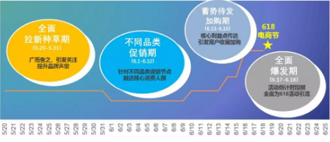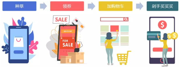 与此相对应,电商平台和品牌广告主营销周期被拉长,也相对有了更充分的营销时间“从长计议”,从电商用户购买决策路径:种草期--领券促销期--加入购物车--支付购买四个阶段进行分阶段沟通,使用不同资源组合策略,深度影响用户心智。