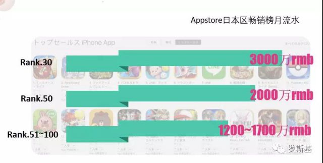 如上图所示,在全球范围内,日本仍然是市场占比较大的一块主要游戏市场。下图是日本AppStore畅销榜里的产品,和中国不太一样的是,一点点的流水差距对于产品在榜单上的排名影响不会那么大。