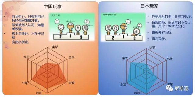 上图是对日本手游市场目前榜单上比较多的产品类型的简单分类。 从经验上看,国内市场中有几个类型是不太合适日本市场的,比如武侠、仙侠、玄幻,这三种类型,在日本市场很难被接受。可以被接受的类型有一个,就是中西方神话大乱斗,这是不会错的一个类型。比如将希腊神话、罗马神话、北欧神话、中国神话、日本神话中的人物全部集结到一起做成卡牌游戏,这种游戏如果归类的话要是属于幻想类,这种世界观架构的产品放到日本市场是不容易出错的一个类型。 出海之前,要做哪些调整 说到调整,我们首先要认识到中国用户和日本用户根本上的一些区别。 最简单的层面,中国用户有个非常大的特点,只看结果,通俗一点,我看到一个人花了50,那么我花100块就必须得打败他。这种在我们看来非常正常的事,放到日本就是不对的,在日本,你要让玩家在花钱过程中体会到乐趣,以及在游戏中进行参与和操作,给他一定操作空间,让他感受到成就感。