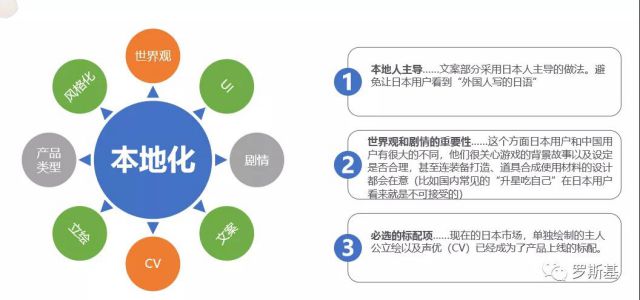 另外,国内大部分游戏对于用户来说过于智能和傻瓜化,很多游戏新手引导带着走,玩家不知道做过什么就已经四五十级了。这种方式苹果也是比较反感的,游戏产品会因为过于智能化的新手引导可能被苹果打回。 上个图是中国玩家和日本玩家的对比。 首先,中国和日本玩家对于游戏类型都是通吃的; 其次,包体方面,现在我们下游戏广告推广软文包体都比较大,而日本游戏通常是上很小一个包,玩家进入后再热更新。 然后是炫耀、画面、乐趣这些,可以从图表中比较清晰看出二者的差别。 要重点说的问题是细节,我们的游戏不太重视世界观细节,玩家们往往是我不知道我怎么来的,我只要爽就行了。但是在日本,玩家需要游戏有详细的世界观,主人公的背景和来历,走出新手村的原因等等,都需要在故事里为玩家交代清楚。 提到故事就难免要说本地化,这里说的本地化并不是把中文翻译成日语,在游戏出海日本的过程中,本地化涉及到的是世界观的重塑、UI的调整、剧情的修改、文案的翻译、配音、立绘的修改等等很多歌方面,还会涉及到游戏产品细节的调整和风格化的东西。