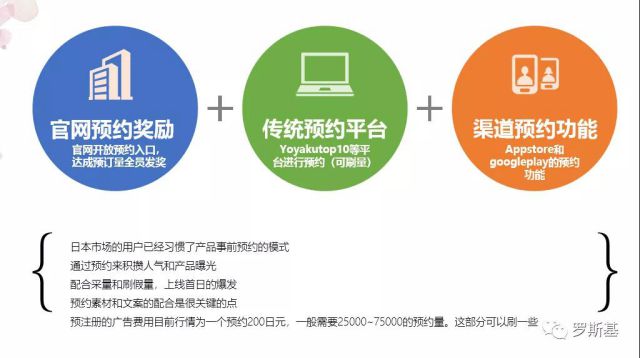 举例,我们曾经做过一次调研,游戏中用户提出最多的建议是:我们不要看外国人写的日语。事实上我们的客服团队都很有经验,都是日本长大的中国人,或者日语专业一级,或者工作超过10年的人等等。但是作为中国人,日语讲得再好,日本人也一眼就能看出是外国人写的,所以本地化的文字方面,最后一定要有日本人最后来做检查和确认。而剧情上,可能需要日本作家来写剧情,不然日本人看到剧情会觉得非常奇怪。 日本游戏市场的预约和买量 在日本市场做游戏的预约有三种方式,一是通过自己的官网,二是通过传统的预约平台,三是通过渠道的预约功能,如下图: