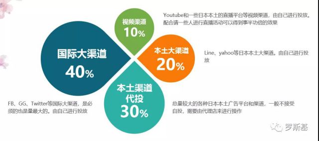 一般来说,预约的转化率是15%,这个预约可以保证产品在上线首日的爆发。在传统的预约平台是可以刷数据的的,日本公司一般不会刷,中国产品往往通过刷一下获取更好的排名,以获得更多自然用户。 预约之后,主要获得用户的方式是投放,投放主要有几种渠道:比如Facebook、Google、推特国际大渠道占比40%、本土大渠道如line等等占比20%、本土渠道代投占30%、剩下的就是视频渠道等等。