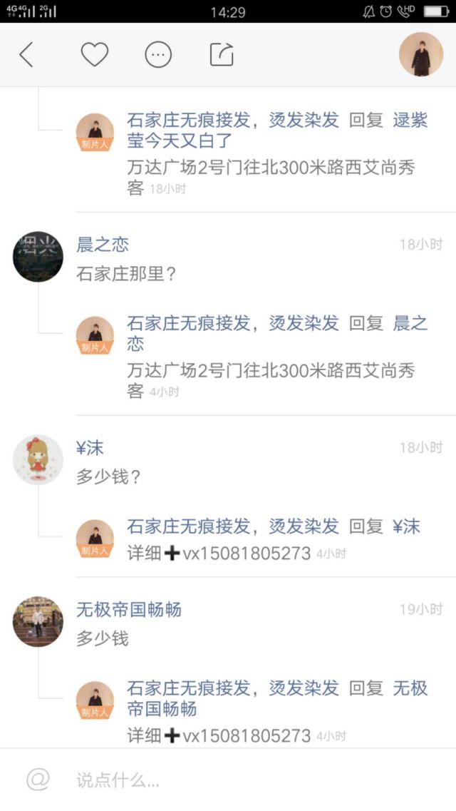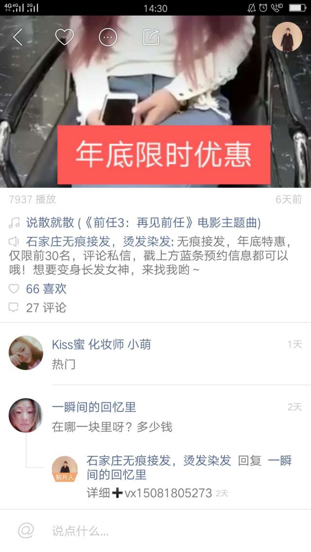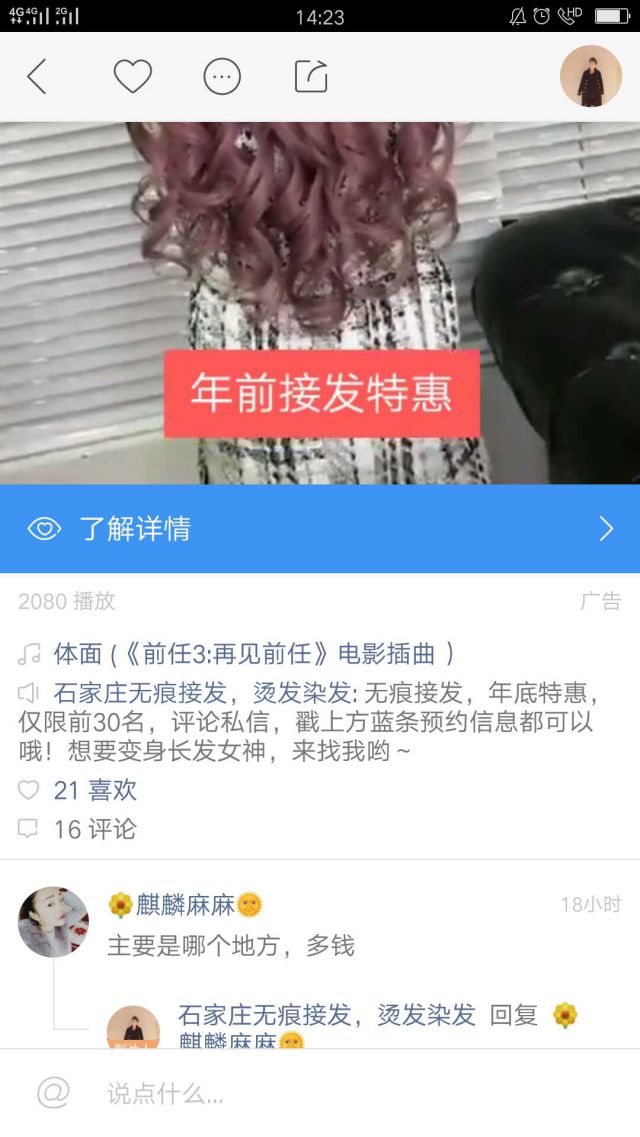 在完成的广告视频中,是从女生一开始进店门再到昨晚无痕接发以后的完整视频,在这一视频中,会有无痕接发的细节过程,并且在视频快要结束的地方,还有关于接发特惠的内容。而这些特惠内容,也是爱美的女生比较关注的内容。对了,在视频中,还有提到如果用户想要了解优惠详情,可以点击广告链接(小蓝条)进行了解。 在这一页面中,小蓝条下方还有文字内容:“年底特惠,仅限30名”,“戳蓝条预约信息”,“评论私信”都是在对用户进行有效的引导,引导用户关注我们的广告内容! 关于广告的评论区的内容也是很丰富的,我们可以简单看下!