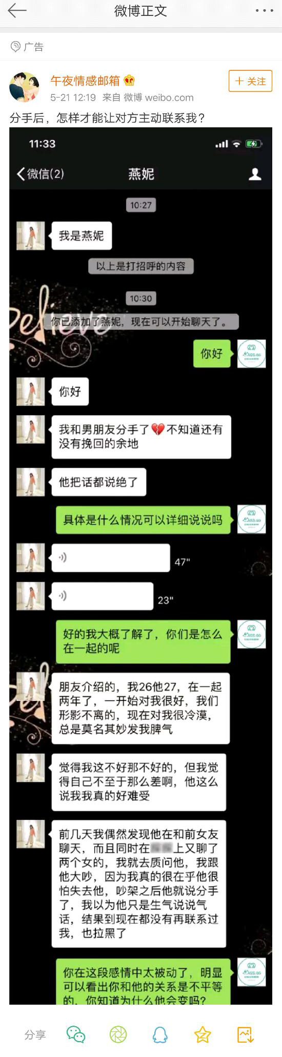 随着现代社会的发展,人们对感情关系质量的关注也在持续增加,对情感咨询行业的需求也在增强,恋爱中的男男女女也约拉越重感情,感情出现问题总有一方非常正视而感到焦虑。 都说“当局者迷旁观者清”对于感情这些事,不得不说听别人说点鸡汤或者听别人分析还是非常有用的,总比自己想破脑袋想不出原因各种纠结和愤怒来的比较好。 小编认为情感咨询这类的广告最合适投放给年轻群体,所以在投放广告的时候可以添加一些年龄和生活状态等标签,实际结合用户的特点选择定向投放。 情感咨询方面的话题很容易引起用户的共鸣,所以如果选择合适的标签可以大大增加广告的转化收割精准用户。 说了这么多先来看看午夜情感邮箱投放的微博广告案例。