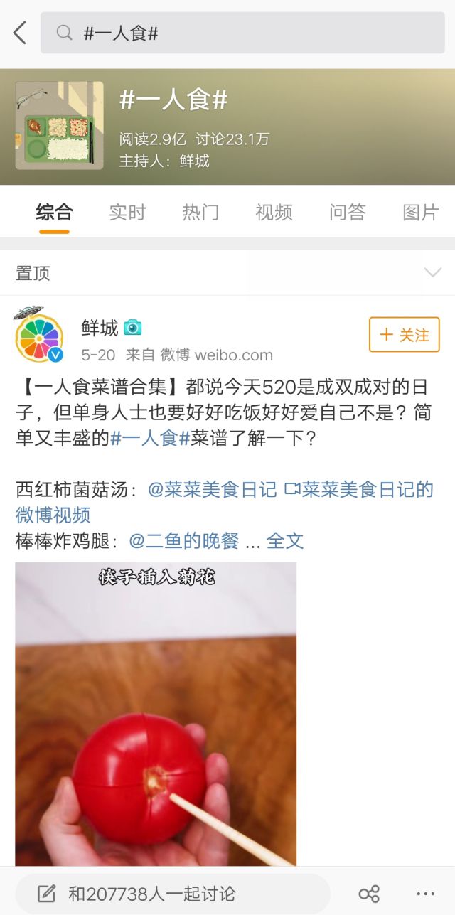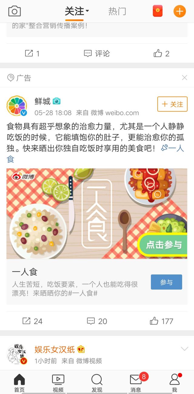 鲜城是微博和新浪联手打造的同城吃喝玩乐的精品推荐应用,里面有很多美食家为用户推荐每位菜肴以及美味菜肴的做法等,还有一些周边玩和团购优惠、休闲娱乐等咨询,小伙伴们如果不知道吃什么饭菜可以去里面找,还有教程视频。 小编关注的是鲜城的官方微博,鲜城现在还有APP的,小编在微博上看到了鲜城的广告就忍不住的关注了鲜城的微博,点击进去看到美食小编就沦陷了,毕竟对于美食小编是没有丝毫抵抗力的。 鲜城这次投放的微博广告主要是推广#一人食#话题的,看到广告文案,不得不说,文案说出了食物的真谛,促进用户主动分享的积极性,毕竟对于美食,这是一个聊不完的话题,分享美食很多用户都乐意参与吧。