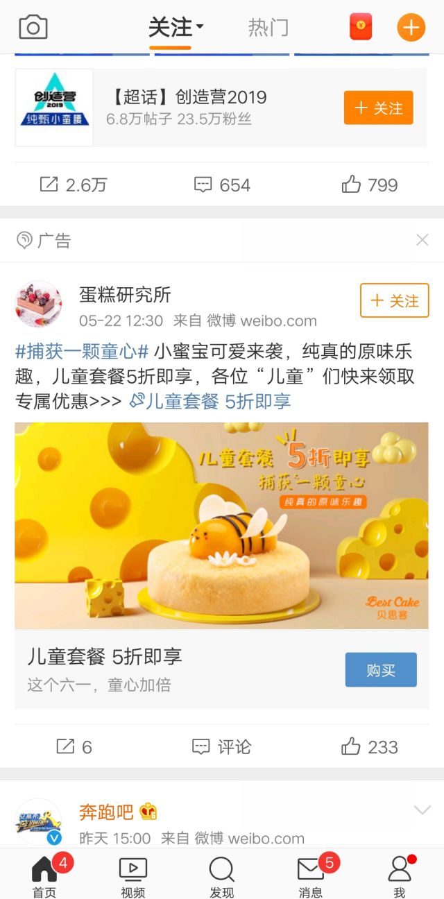 “贝思客”主要是以互联网思维为依托,利用O2O线上线下为销售,用户可以在贝思客的网站、APP或者直接致电就可以直接在线订蛋糕,并且蛋糕的质量和服务都是值得用户信赖的。 这么一个依托互联网的产品自然在线上也少不了宣传渠道,没错了,贝思客投放了信息流广告,支持用户通过看到广告之后在线定蛋糕。 贝思客投放微博广告,在最近几天儿童节之际推出推出儿童套餐蛋糕,看看贝克思是怎么做儿童节借势营销的吧! 广告的外层主要推出蛋糕的小蜜宝系列,并且还有5折优惠如何推广企业推广,并且广告的配图也是用产品的图片来为广告配图,背景色也用黄色蜂蜜的形状,也是一幅充满童心的画面。捕获一颗童心,儿童套餐5这优惠,这波福利当真是不舍得错过。