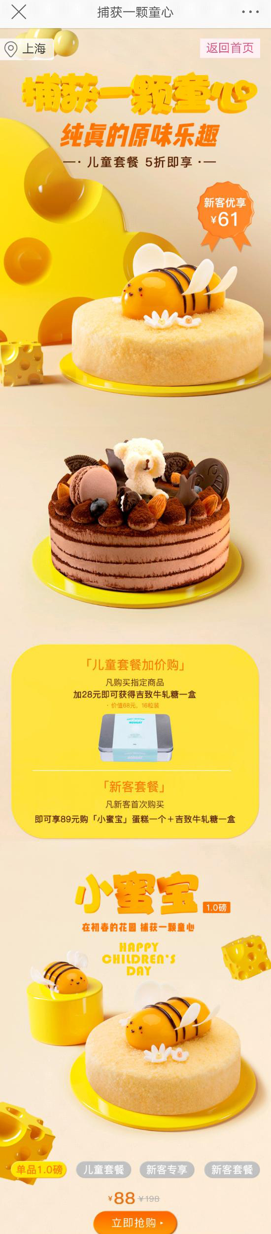 点击广告进入落地页,落地页有各种适合儿童的蛋糕款式,加上背景图,看起来满屏诱惑,除了5折的活动之外,新客还可以享受特别福利,有机会获得89元的小蜜宝蛋糕一个,另外还会获得一盒牛轧糖,落地页有很长,展示了很多儿童款各种图案的蛋糕,对于小编这种非儿童来说诱惑都非常的大更何况是有一颗童心的宝宝呢?恐怕更抵挡不住诱惑了吧!各种蛋糕款式身边都有其对应的价格并且还有“立即抢购”的按钮,用户喜欢的就可以直接点击按钮在线下单了!