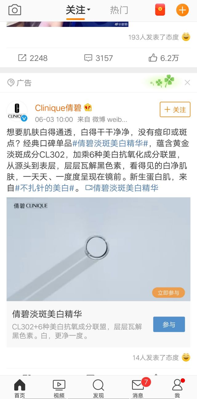 倩碧现在隶属于雅诗兰黛集团,其先因为护肤三步曲世界闻名,现编虽然没用过倩碧的产品,但是对于品牌还是略有耳闻的,但是小编想把口碑比较好的护肤品牌都试用一遍,这样的愿望可能有点痴人说梦,因为买一款就可以用很长时间,所以,小伙伴们别忘了还有试用这一说呢! 倩影投放微博广告推广产品用户可以免费参与领取试用装,通过广告分析看看倩碧是如何通过广告推出试用装获取用户吧! 广告通过视频展现产品,广告的文案对产品描述,用户可以了解到产品由哪些亮点,例如可以让皮肤没有痘印或者斑点,达到肌肤通透白的干干净净的效果,通过视频的样式对产品展示也更方便用户了解,从产品外形到对比等,吸引用户参与。