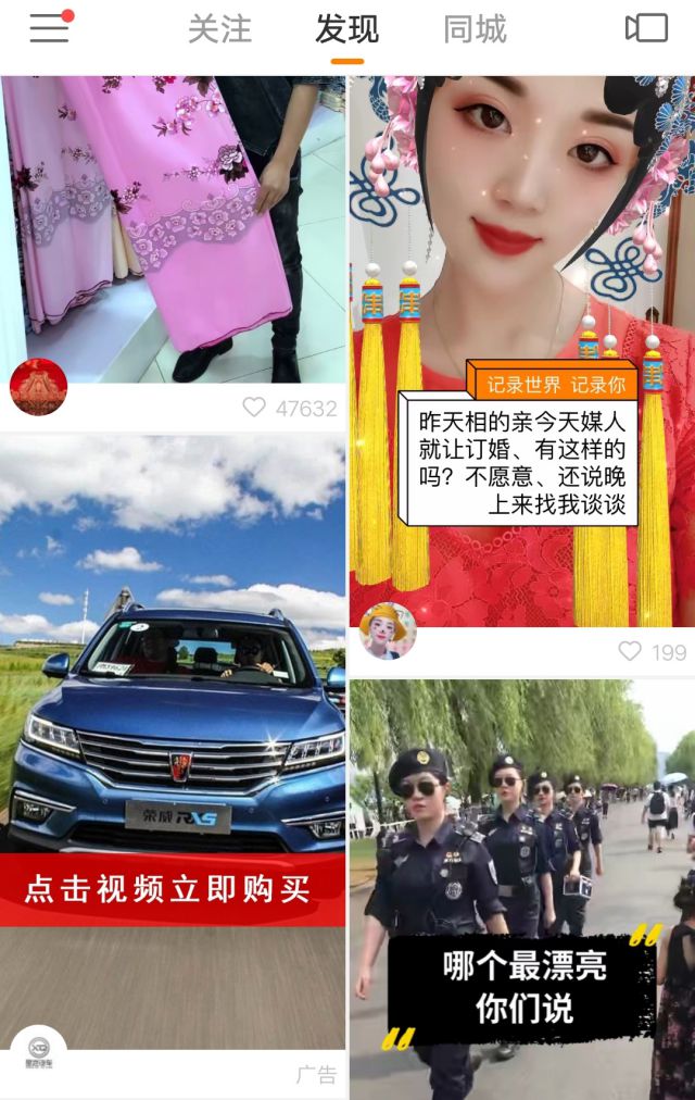 优点: 荣威推广的广告样式以及素材和其他的汽车广告不太一样,其他平台投放的广告展示产品最华丽的一面,会对产品进行“包装”,而荣威投放的广告更接地气,对于快手的用户来说,广告更贴近用户,在用户外层看到广告的时候不会被立刻打上广告的标签从而被个别用户直接忽视。