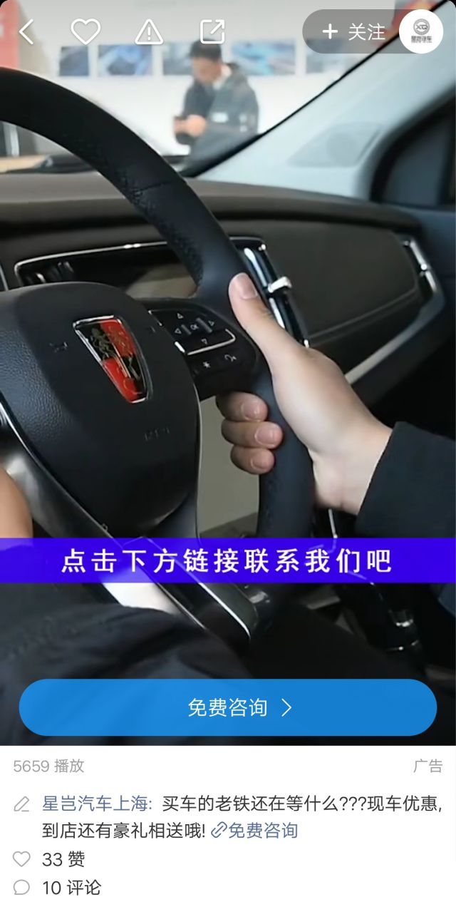 荣威是上海汽车工业集团总公司旗下的一款汽车品牌。放眼国内的汽车市场,怎么推广和营销无论是国内品牌的还是国外品牌都有很多,可以说汽车行业市场压力还是很大的,毕竟品牌多,而需要买车子的用户却没那么多,毕竟汽车对于一般的用户也不是说买就买的。 由于市场压力,很多汽车品牌选择投放信息流广告,多以试驾、优惠等方式吸引用户,荣威也投放了信息流广告,选择的平台是,看看荣威选用的哪种样式投放的广告吧! 一:广告外层 广告外层封面选用荣威RX5汽车的正面图片,封面文字“点击视频立即购买”,引导用户点击视频了解更多。 缺点: 1.没有卖点,一般用户对优惠信息等比较关注,或者是汽车的特点等,都可以展现出来一部分吸引用户。 2.图片背景选择不是很吸引用户,小编第一眼看到图片第一感觉就是抠图,图片没有吸引力,但是更接地气。
