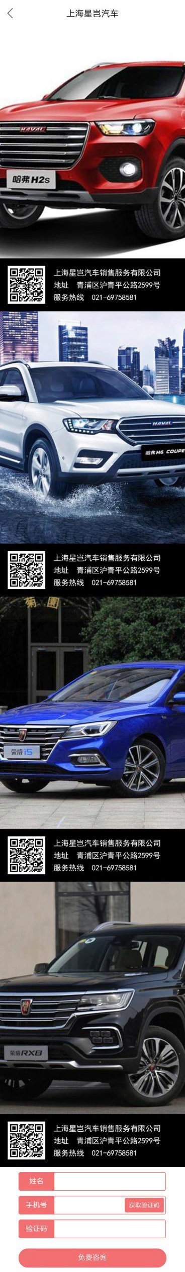 三:广告落地页 点击视频连接或者小字部分的链接,跳转到广告落地页,落地页展示4种车型而且是旗下的两个品牌哈弗、荣威不同型号的4款,每一款车的下方都有线下地址、公司名称和服务热线,最下方的表单信息,用户可以输入信息免费咨询,同时还可以帮助广告主收集意向用户信息进行下一步的转化,落地页多车型的展示让用户有更多的选择。
