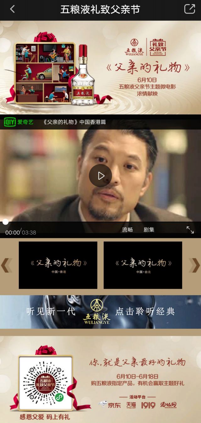 进入广告了解详情,《父亲的礼物》不仅有广告中的那一版,还有香港版、台北版......针对不同地区的用户有不同的版本,五粮液这次也是别有用心。落地页的最后推出五粮液幅拼接的小程序的二维码,用户可以扫码购买五粮液的指定产品就有机会赢取此次活动的主题好礼。父亲节不仅是一个节日,更是使亲情升温的催化剂,五粮液借势父亲节做广告,这篇短片有没有打动你? 最后小编再提醒各位广告主一遍,父亲节还有三天,可以投放广告预热了,电商行业的想要增加产品销量抓紧最后这个节日热点。