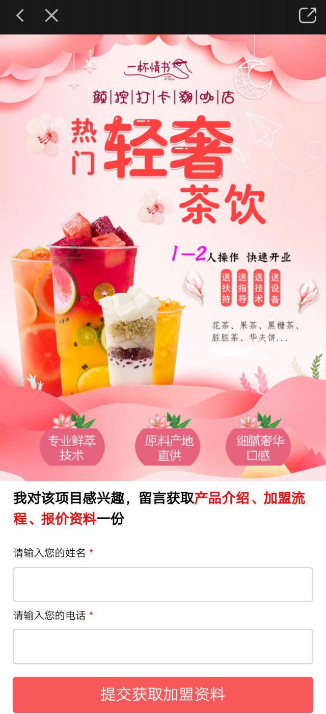 落地页: 点击广告进入落地页之后,整个落地页都是粉色系,背景颜色更能趁出产品和品牌的基调,落地页的上方还有网站建设和维护产品的展示以及开店的优势和各种蜂产品类型,一杯情书不仅有饮品还有甜点。 总之落地页展示出各种用户加盟的优势,再往下看就是表单,对加盟感兴趣的可以填写表单信息获取产品介绍、加盟流程、报价资料一份,这对意向用户来说也是一种福利,反而这些小福利可以降低用户对留信息的排斥心理,除此之外广告主在广告素材还可以收集到这些客户信息,进行下一步的转化。