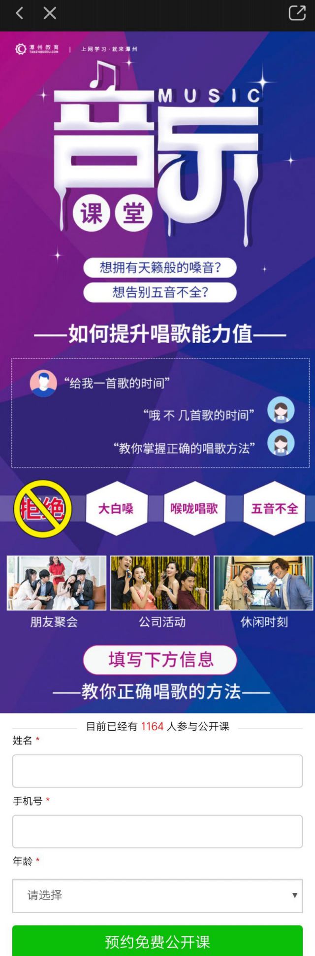 广告的落地页满满的音乐气息,抓住用户“大白嗓、喉咙唱歌、五音不全”的痛点吸引用户参加,参加的用户可以填写信息报名,用户提交信息之大网站建设后,广告主收集一条有用客资可以在线下进一步跟进。
