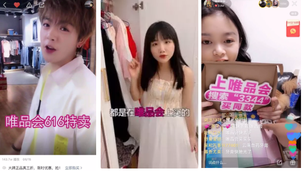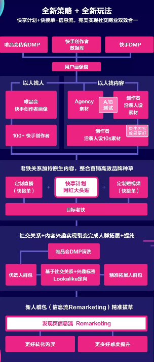 (从左往右)快接单定制短视频、快享计划-网红大头贴、快直播推广 唯品会与快手针对此次大促前期进行了充分调研,并在此基础上制定了尊重快手用户体验的立体化投放方案——以目标受众人群画像来筛选创作者进行带货;以直播、贴片广告的形式实现产品及品牌曝光,向用户广泛种草;以社交+内容裂变的方式完成人群的二次精准拓展,从而带来实际转化。