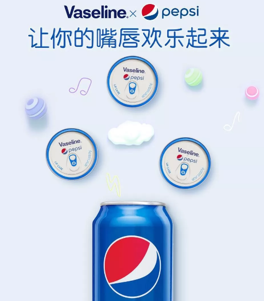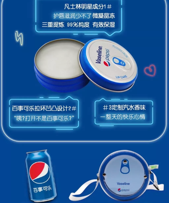 另外由于此次联名的目标受众是爱好潮流的年轻人,凡士林考虑到他们在夏季一定需要一款打底润唇膏,来使唇妆更加闪亮,而凡士林护唇小铁罐适合随身携带的潮流外观就使它更受青睐。 最重要也是最动人的一点来自于两大品牌对于产品的定位,和寄予它的意义——“凡事皆乐”。如果说百事可乐的特性是凉爽、给人快乐,凡士林的特性是温和、治愈肌肤损伤。 护唇小铁罐“凡事皆乐”的意义在于从肌肤、精神双重疗愈年轻人痛点。完美融合他们的特性,蕴含三重提炼,99%纯度的凡士林明星成分微凝晶冻,有效保湿修复唇部肌肤。还有定制的甜美汽水香味留在唇间给你一天好心情。