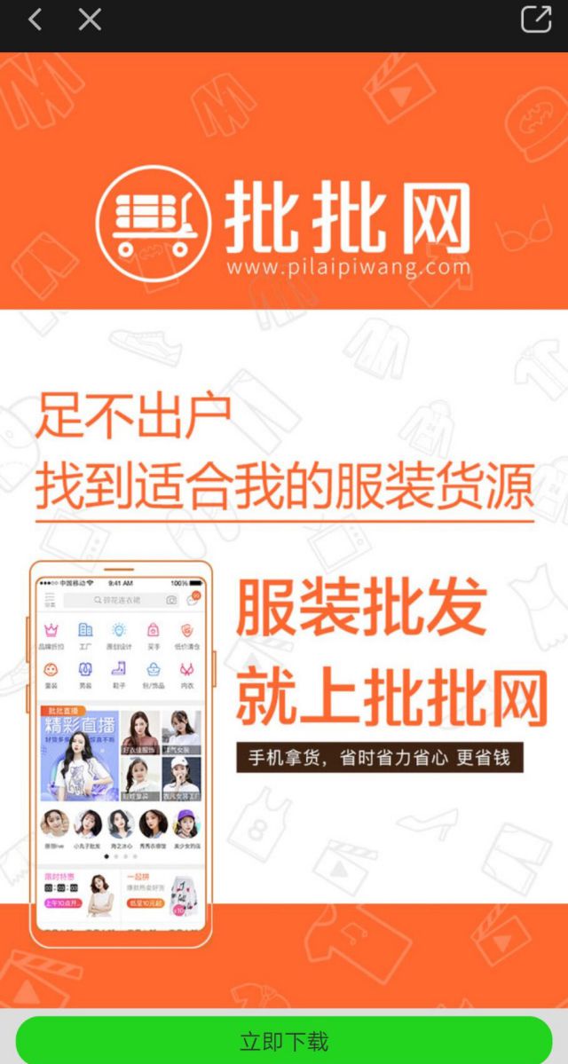 批批网是一款基于传统服装批发的移动批发应用软件,专门为服装行业的店主、批发商、贸易商以及电商店主提供货源的平台,里面的服装多来自广州、杭州等服装产业基地,为用户提供便捷、实惠、拿货等一站式的批发服务。 无论是开店的店主还是批发商,或者是自己想开一个网店没有货源,都可以在批批网找自己喜欢的商品批发,用户可以根据批批网的直播选择心仪的商品然后采购。 这边方便的APP服装行业的小伙伴们可能还有很多不了解,所以批批网投放了,小伙伴们看过来。 广告外层图片突出批批网的特点,可以通过直播看货,并且是商家直接批发,代表着没有中间商赚差价,专业做服装批发的平台。