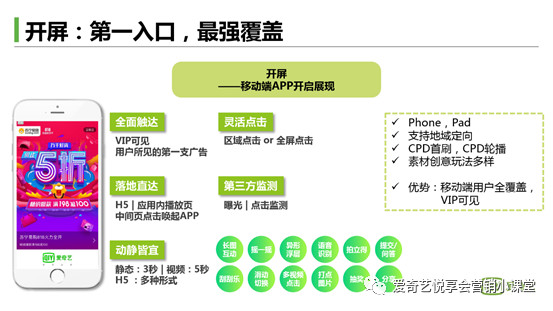 爱奇艺商业广告产品,目前共分为8个大类:OTV、Display、Content、Banner、Overlay、Data、Feeds和Interactive 。今天给大家带来的是日常生活中常见的四大展示广告。 第一课、开屏:第一入口,最强覆盖 广告展示位置:开屏广告是移动端APP打开时展现的全屏广告,VIP用户可见。 使用场景:如广告主看重爱奇艺VIP人群,需要大尺寸的广告展示来宣传新品或活动,需要具有冲击力的展现形式来保持品牌格调,推荐投放开屏广告。