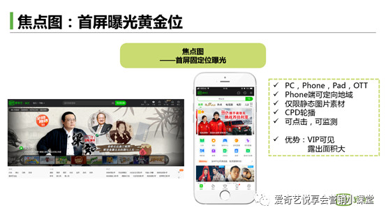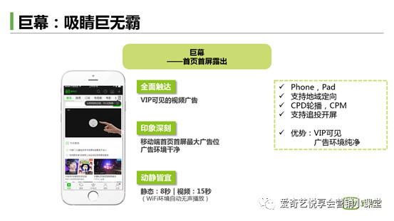 案例:在2017年双11期间,电商网站唯品会就选择了爱奇艺开屏广告为其电商导流。当时投放了以代言人周杰伦为主体的拆红包的动态开屏广告,广告全屏展现的时候视觉冲击力很强,且红包形式能有效地提升用户点击广告的意愿。投放3天,累计曝光4000万次,吸引点击340万,导流效果明显。 第二课、巨幕:吸睛巨无霸 广告展示位置:进入app首页展示的半屏广告。巨幕位于爱奇艺APP网络软文推广网站首页首屏,整体广告环境干净;可实现静态图和视频展示,视频时长可达15秒。 使用场景:如广告主想要用影响V人群,需宣传新品或活动,推荐投放巨幕广告。