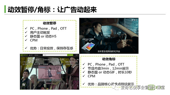 案例:2018年5月,一汽大众首款SUV新车上市,选择投放爱奇艺焦点图来展示新车信息。投放期内,每一个到频道内的用户都能看到广告。并且当时在爱奇艺站内搭建客户节目品牌专区,借势热点内容,同时大面积广告露出,宣传新车上市。 第四课、动效暂停/角标:让广告动起来 广告展示位置:在用户实际观影过程中,在暂停或播放状态下的框内广告,分别是暂停和角标广告。均都支持静态图素材或者动态素材,实现“让广告动起来”。 使用场景:建议作为日常的常规投放,保持品牌在受众心中的存在感,并且能持续地简单展示品牌的核心诉求点。