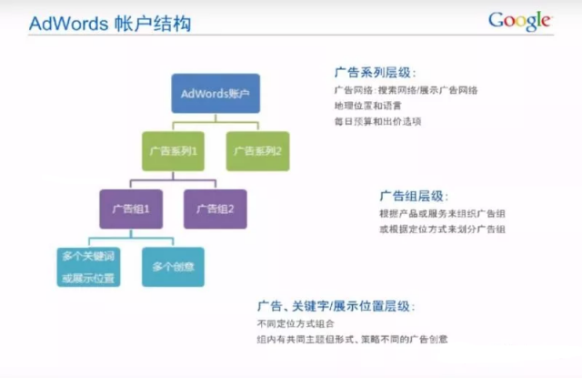 首先谈谈Google AdWords账户结构,其实跟差不多,由多个广告系列、广告组、关键词及广告创意组成。上图参照: