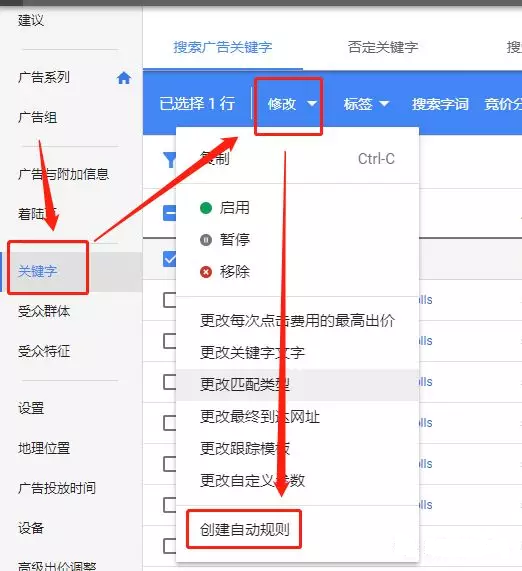 新建广告系列 > 选择好广告类型 > 设置目标为网站流量 > 填好商家网站域名 > 然后开始创建广告系列 > 设置好广告组 > 开始制作广告。 (当然在制作这一系列过程前可先参考同行数据,设置好自己的预算。) 在配置关键字的时候,Google关键字规划师是个不错的工具;这里就不一一细说了。对于关键字匹配的修饰符,这里再罗列一下,因为自己总是记混。 1.广泛匹配的字符:+ 2.词组匹配的字符:“” 3.完全匹配的字符:【】 4.否定匹配的字符:- 关键字设置排名规则:通过GA上的数据,查看关键字,选择质量(转化)较高的关键字,在Google AdWords 的关键字中找到该词,点击修改 > 创建自动规则 > 选择规则类型为“更改关键字出价” > 操作设置为“将出价提高为首页展示所需要的每次点击费用金额” > 然后设置最高出价限制(根据产品关键字投放价格)> 条件添加为“平均排名” > 日期范围设置为“前一天” > 最后规则名称自己设置(我这里按照“平均排名大于第一名,小于第四名”设置的)