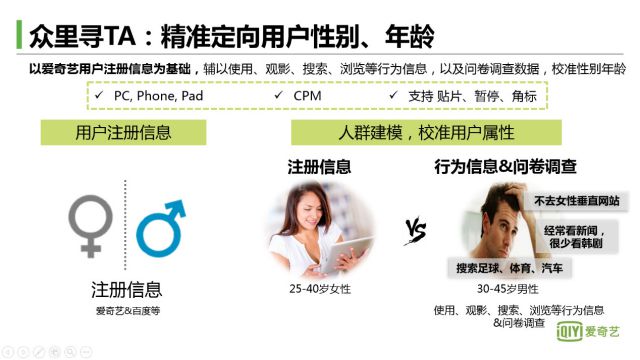 之前小编给大家介绍过爱奇艺的各种贴片产品和不同形式的广告,今天就为大家呈现主打精准的投放方式,主要有:众里寻TA、一搜百映、DMP自有标签和DMP品牌数据管家,下面就为大家一一介绍。 第一课:众里寻TA 精准定向用户性别、年龄 展现机制:定向用户性别和年龄进行精准投放。 使用建议:如品牌受众具有明显的性别或者年龄区隔,建议按核心受众的性别年龄来投放众里寻TA。