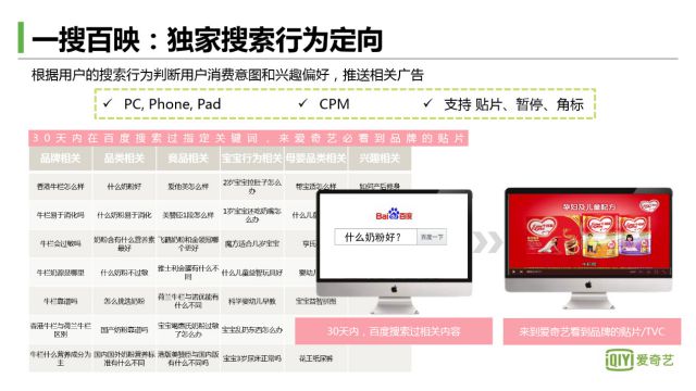 经典案例:在美赞臣定向20-35岁的女性投放贴片广告,通过第三方监测公司数据发现,美赞臣众里寻TA投放后的TA人群占比对比常规的贴片投放提升了46%,TA占比的提升明显。此外美赞臣客户对于众里寻TA投放的认可度比较高,全年都在不间断的投放。 第二课:一搜百映 独家搜索定向行为 展现机制:基于爱奇艺与百度的合作关系,使用用户搜索行为的广告定向,是爱奇艺独家精准投放方式。 使用建议:如品牌想要用户在搜集信息的阶段就接触到品牌,或者在用户产生意图行为时就触达到其潜在消费者,推荐投放一搜百映。