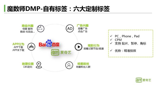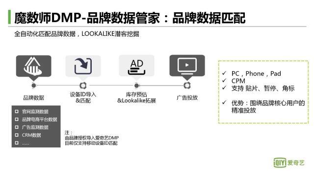 经典案例:2017年9月,京东金融APP全新改版,需要引导潜在客群下载新版APP,当时使用爱奇艺DMP APP定向投放。投放了PC, Phone和Pad端,全国范围投放,精准吸引潜在客群下载更新品牌营销推广方案APP。同期客户还投放了定剧前贴片,对比下来,DMP APP定向投放的广告显著高于定剧投放。 第四课:魔数师DMP-品牌数据管家 品牌数据匹配 展现机制:品牌将自己的官网监测数据、电商平台数据、其他在线广告投放监测数据和自有CRM数据等等,以设备ID的方式导入到爱奇艺魔数师DMP进行匹配,通过匹配找出在爱奇艺平台的品牌核心用户,然后魔数师DMP根据已匹配的品牌核心人群的共有特性,借助算法找到具有这些特性的高相关人群做lookalike潜客拓展,最后可针对匹配出来的品牌核心人群和lookalike后的潜客人群定向投放广告。 使用建议:如客户需围绕品牌核心用户来做精准投放,建议使用魔数师DMP-品牌数据管家。