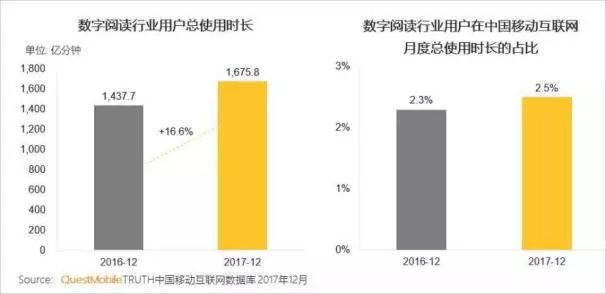 用户阅读总时长,增长约16.6%,用户月度使用总时长占比有小幅提升。17年12月份用户人均单日使用时长同比增长9.6%。