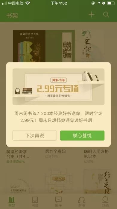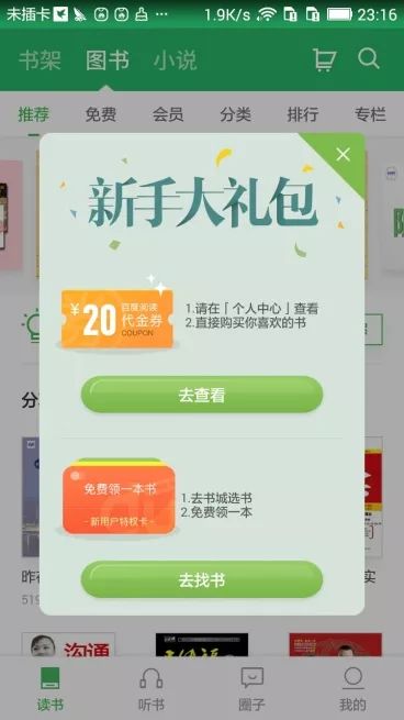 相比于听书和视频,阅读是一种相对枯燥的学习方式,对时间长度要求也比较高。通过对业务逻辑和商业逻辑、竞争环境分析、需要重点关注的几个数据维度: 1、获取新用户:渠道转化率、渠道获客成本、新用户注册数量 2、留存:次日留存、7日留存、月留存、7日流失数、7日回访用户 3、促活:日活跃用户、平均用户阅读时长、push消息打开阅读量、用户评论量、用户关注数量、用户粉丝量、活动参与数量 4、变现:付费会员购买数量、用户付费购买书籍量及金额、用户购买听书等其他频道产品数量及金额、用户代金券获取及使用数量 5、传播:用户分享阅历次数、用户邀请好友下载数量、用户分享活动链接数量等 通过对重点数据的分析,在产品设计和运营上重点需关注的几个激励点为:新用户注册、浏览书籍并加入书架、每日阅读、发表观点、与其他读者互动、付费购买、分享传播。 新用户留存:新用户下载后,可收到的福利了有:20元无门槛代金券(有使用期限,便于刺激用户尽快使用购买)、免费领一本书。同时,在书架处预先送给用户两本书,让用户对书架产生认知,激发用户开始阅读。书籍的吸引度对于次日留存有很好的提升效果,一旦开始进入阅读模式,就有进一步运营的空间。 目前赠送的两本书是《妞妞:一个父亲的札记》和《狼图腾》,作者时隔一年后再次下载,仍是这两本书。建议可以对赠书做一些变动调整,结合用户喜好基因来选择发放的书籍,更有利于留存。