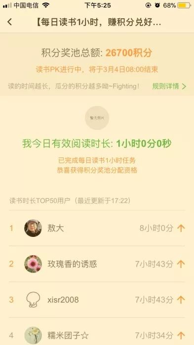 (2)活动举办阅读PK赛,用户投入5积分进入积分池,在规定时间内,每天至少读书1小时,根据读书时长瓜分全部积分,阅读时间越长,分到的积分越多;该活动从设计上来看,利用用户对于排名、比赛的攀比心理,对于用户活跃有一定的激励性。 但在活动开始前几活动过程中,无宣传力度,仅在APP中加入一个角标(如图中红圈处位置),个人认为这样的宣传效果会影响活动的执行效果。根据积分池的分数来看,用户活跃度在周末1万人左右,工作日在5000人左右,对于千万活跃的APP来讲,还是比较低的。