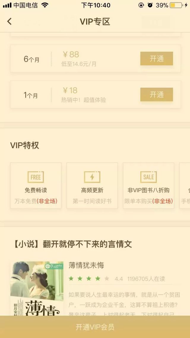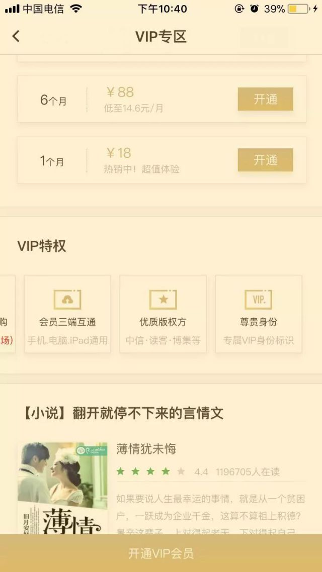 变现:变现主要包括第三方广告投放、会员收费、付费购买单本书籍或音频。广告投放在此不做展开叙述。因部分经管、营销书籍价格几乎与实体书价格等同,且部分包含在V或VIP折扣里,仍可以看做是VIP的助推力手段,故变现部分重点分析VIP会员制度。 会员收费:百度阅读的在17年实施VIP会员制度,分为1年108元、半年88元、1个月18元,上线初期只有1年、半年两类,近期上线了1个月的会员收费级别。
