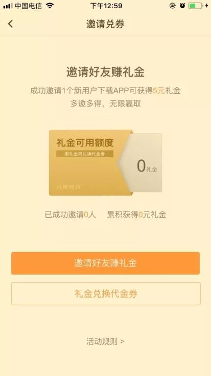 (2)“邀请兑券”,用户通过邀请好友赚礼金,邀请成功邀请新用户且下载APP后老用户获得5元阅读券。老用户及新用户打开页面分别如下。