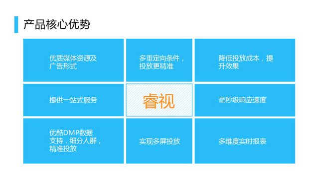 目前,优酷视频的广告已经覆盖全面覆盖电视、手机、PC端,用电脑优酷、手机优酷、以及平板优酷的时候,我们都可以观看到丰富的优酷视频资源,因此在互联网行业,优酷可以说是真正意义上的电视媒体平台。 优酷整合平台优势推出广告投放平台-优酷睿视推广,睿视推广提供丰富的广告位资源,例如优酷土豆视频播放框内的贴片、暂停和移动全屏广告,以及享看广告、页面广告资源等。