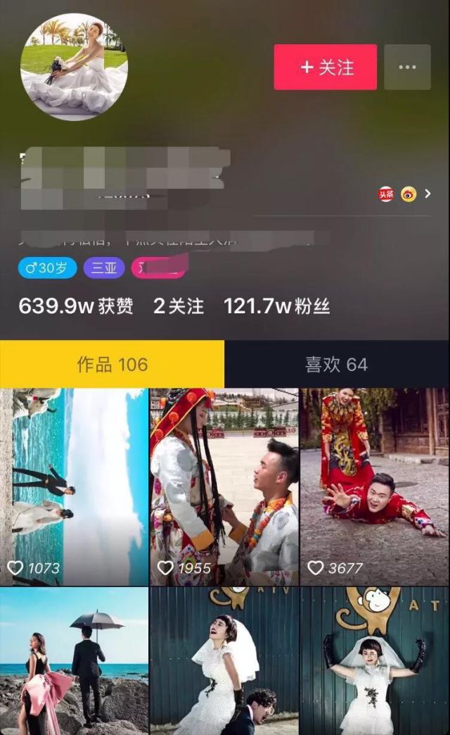 抖音上婚纱摄影的账号也是数不胜数,庞大的用户基数也印证了婚纱摄影行业旅拍的火爆。现在的小姐姐小仙女们谁不想和最爱的人去最想去的地方,拍上一套唯美浪漫的婚纱照呢~