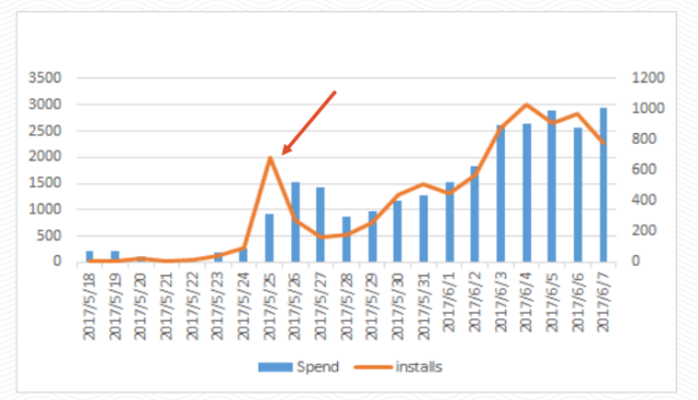 为什么要用VTA? a.VTA可以针对品牌与主提升展示、引导的价值 广告曝光可以加深用户对品牌的印象,大量的曝光可以促使用户产生转化,就会直接跳过用户点击广告的步骤。在线用户中(包含高LTV用户)85%的人都不会点击广告,并且inmobi平台中75%的用户通常都不会去点击广告。 b.与原生广告、视屏广告形成黄金组合拳的价值 视屏广告的是天然的被用户看到,而VTA很适合的归因方式,视频广告和原声广告一样,能够吸引用户眼球;通过视频广告获得的用户的留存率都会高于其他广告的24%。 c.优质流量、用户价值 广告主的广告费用买到的是下载量还是用户? 下图为使用VTA获取新用户的案例