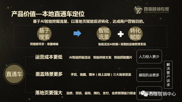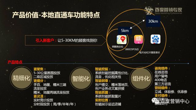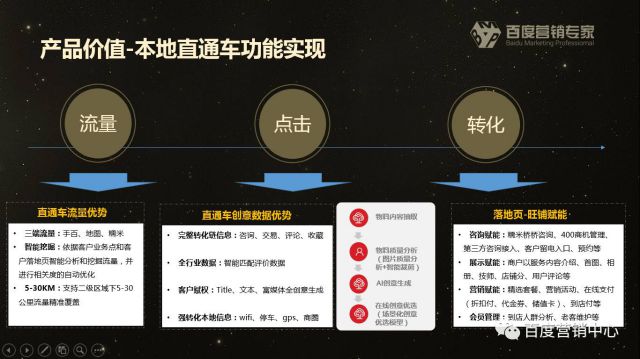 投入成本更低、覆盖场景更多、落地页功能更强大 降低运营成本:AI智能挖掘流量、智能创意生成和优选,使商户降低运营投入; 获得更多的展现:覆盖手百、糯米、地图三大场景流量,帮助商户获得更多的展现机会; 覆盖更多转化:装修、营销、咨询、预约、支付、用户画像、会员管理能力俱全,获得更多转化机会。 本地直通车产品功能特点 整合三大场景能力:手百提供超大精准流量,地图提供精准定位能力,糯米端拥有3800万POI和管理能力(PO电视广告I点代表独立店铺)。