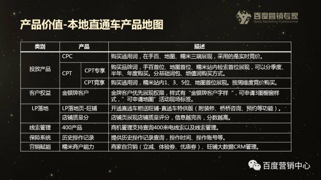 百度业务运营部 高级产品经理 严威威 本次分享主要分为三部分:本地直通车产品价值、生活服务行业赋能介绍、案例分享。 一、本地直通车产品价值 凤巢十多年的发展,客户的营销能力、SEM水平不断提升,竞争不断加剧,为了帮助中小企业更好的在凤巢发展,同时降低客户在人力、培训投入成本,百度本地直通车应运而生。那么基于O2O模式的本地直通车产品,具有什么样的价值才能吸引中小客户呢? 本地直通车产品价值定位