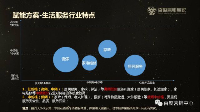 生活服务行业特点 (坐标轴横轴表示周期/频率,划分为高中低频的分布;坐标纵轴表示价格,价格越高,决策的周期越长;圈的大小代表第二季度在本地直通车消费的体量。) 生活服务行业客户多大集中在中低价客户。其中搬家、居民服务等价格较低,对价格敏感度较高的行业在直通车发展更好。这也依赖于本地直通车具备较强的价格干预能力。 生活服务行业用户分析