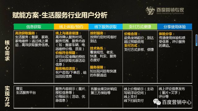 用户端的核心需求和实现方式 商户满足用户诉求的方式: 获取信息:生活服务可通过线上获取,如58、糯米等生活平台; 线上体验:商户通过服务内容,真实图片,授权图片等展示服务信息,并通过活动等方式满足用户价格预期; 线下服务:服务体验保障消除用户的后顾之忧; 支付方式:明示价格,多样便捷的支付方式; 体验分享:高评分/优质评论有利于用户决策。 生活服务行业用户满足