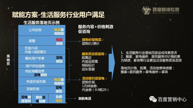 生活服务行业落地页 促进咨询转化主要由两个部分构成:服务内容和价格刺激。 通过后台咨询组件点击数据分析,我们发现搬家、居民服务、家电维修行业对价格刺激更敏感,所带来的咨询点击占比大,且远高于全行业平均水平,家政服务服务内容更关注。 生活服务行业点击和转化效果