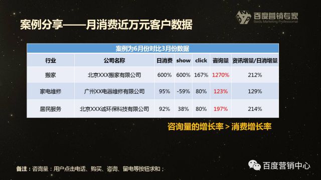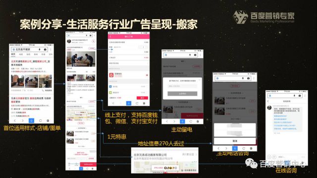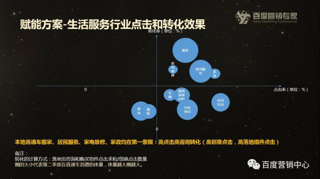 本地直通车生活服务行业效果 (横轴表示点击率,纵轴表示转化率,圈的大小表示消费体量) 搬家、居民服务、家政以及家电维修在直通车产品是高点击、高转化行业。本地直通车的强本地属性流量、创意更有利于客户降低获客成本。 第三、案例分享