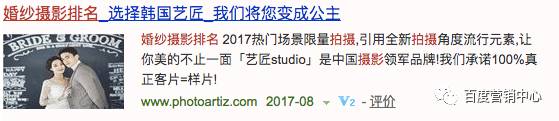婚庆行业,特别是婚纱摄影行业教育危机公关处置案用户更关注精准营销去打图片展现效果,优质、丰富的图片广告样式会为客户带来更多的点击量。 为帮助婚庆行业提升点击量,整合了凤巢物料库以及资质对应的该客户在糯米上传的物料,为客户争取更多的高级样式展现机会,微信搜索以促进提升。 广告样式DEMO(PC端) 四图样式:限定首位展现
