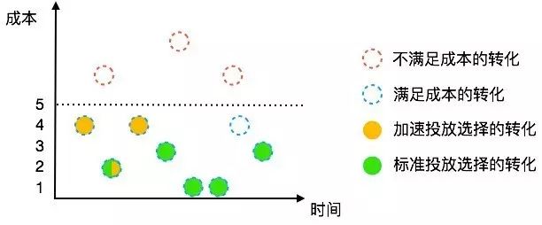 也就是说,在无法消耗和消耗达不到预算的时候,无论选择标准投放还是加速投放,都没有本质的区别。 从上图也可以看出,在无法消耗或者消耗达不到预算的时候,提高预算也没有任何帮助(这里很多的广告主容易误解)。这个阶段大家只能多从创意、定向和出价方面进行优化,来提高广告的竞争力。 标准投放和加速投放的区别 当广告竞争力足够花完预算的时候,预算的分配方式就尤为重要了。目前今日头条提供了两种预算分配方式:标准投放和加速投放。这两种不同的预算分配方式的目标是不同的: 标准投放:致力于在整个投放周期内较为均匀的花费完预算,投放系统会根据竞价环境智能的分配预算和调整出价,以获得成本最低的投放效果,即同样的预算下获得最多的优化目标(展示、点击或转化)。大部分情况下,我们推荐选择这种预算分配模式。 加速投放:尽可能快地花完预算,这通常会带来预算花费速度的不可预期,尤其是广告主对广告竞争力不甚了解的时候,很容易造成投不出去或消耗太快的情况,同时投放的成本也不是最低的。但是,在某些时效性较强的推广需求中,还是有需要选择加速投放的。 以一个具体的案例来说明标准投放和加速投放的区别。假设我们有一个推广应用的需求,并且决定使用安装完成这种转化方式作为优化目标,日预算设为10元(仅作举例,实际平台目前最低预算设置为100元),目标成本是5元,那么考虑下图这种场景: