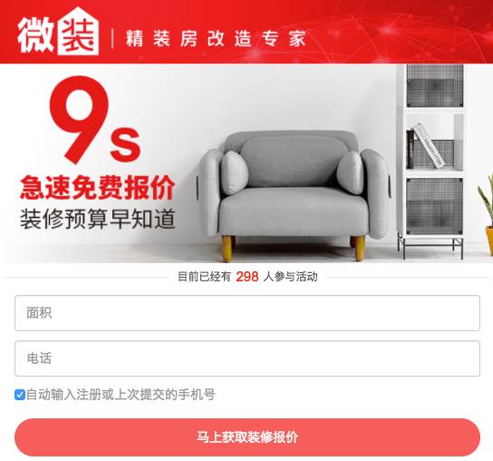 服务优势图例 5.落地页底部 再次出现表单且辅以计数组建,作为客户浏览完这个落地页的心里预期是否选择填写表单。 总结一下今儿的干货 头图的形式与目的:非常赞同《Don't make me think》里说的: “那些精心修饰的文字对用户来说更像是‘以时速100公里的速度驶过的广告牌’......要为扫描而设计、不要为阅读而设计。” 设计师看过几版素材有过这样的点评,感受下:“这几版素材设计过度了,过分纠结于光影啊画面感啊什么的,结果就是重点信息没能强调,猛地一看就是五颜六色一片,什么信息都获取不到”。 因此,我们要知道形式服务于目的,精简文案,去掉不必要没有实质内容的文字,凸显价格及福利优势,加以报价引导提交表单是目的。 落地页的整体布局:上面我们提到了头图+表单之后会引出装修案例,服务优势和售后服务等重要信息块,如果落地页的文字过多,不能用通俗易懂的方式向用户清楚地阐述产品的利益点,就果断重新编辑和优化文案或者使用图片加说明的形式。 PS:有些小伙伴说服务优势和别家总体其实差不多,不知道怎么凸显出来,其实不妨用对比图试试,简单明了。 视觉风格:主题明确一目了然。在筛选家装行业高CVR落地页的时候我们发现,整体风格要偏干净、低奢,装潢图要高清有档次,规避特别艳丽的颜色,以清爽的冷色系为主(特殊活动除外)。 表单细节不能忽视:表单辅以计数组建成为了高转化标配,按钮文案吸引人最加分。 好了,今天就分享到这里。优化指导1.0希望可以给广告主一些指导性建议,在2.0实验中,我们将引入热图工具,对用户行为进行追踪分析,监测转化漏斗,分析用户流动轨迹,总结访客在什么位置因为哪些不适当的元素导致分心。敬请关注!