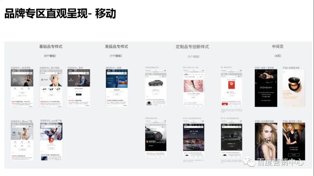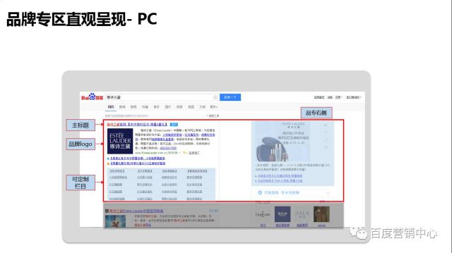 首先介绍一下品牌专区,上面两幅图是品专的广告展现形式,首屏首位展现。第一幅是PC端样式,PC端样式种类很多,上图是一个基础品牌样式,对于品牌的呈现效果很强。第二幅是移动端样式。 品专做了无线端的升级,给用户品牌霸屏的强势冲击感。 品牌专区的营销价值
