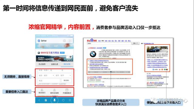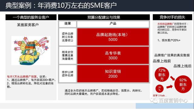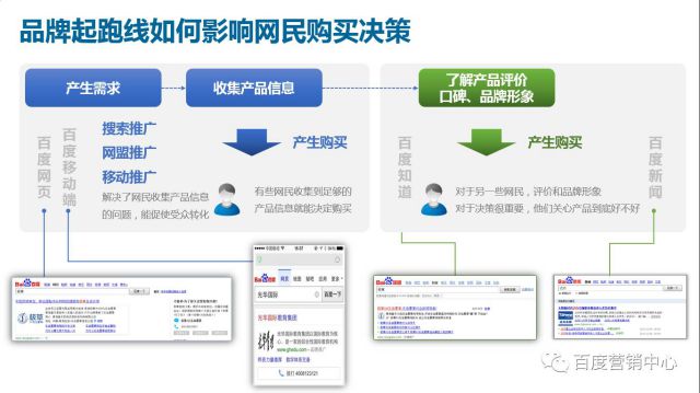 接下来结合实际案例分析一下品牌广告在营销过程当中的价值。 对于一个客户,需要首先购买品牌起跑线,它是流量的收口,任何地方做出来的品牌形象都需要品牌起跑线。品牌起跑线能够提升形象、树立品牌。其次是品牌华表,华表能够精准定位、覆盖流量,让网站营销推广如何做你的品牌海量曝光。 上图最右侧有个实例。这个数据是品牌推广上线之前的数据,用户搜索教育新东方,新东方的搜索结果在首位,新东方的用户点击占比是72%,剩下的28%点了竞争对手的页面,这些用户搜了新东方,却没有浏览新东方的页面,他们为什么会流失?是因为他们不是新东方的忠实用户,他们对于新东方没有品牌的概念,没有特别深的信赖程度,最终造成了新东方的流量损失。